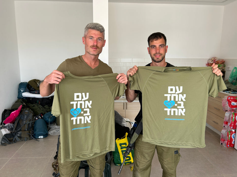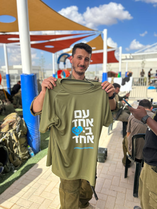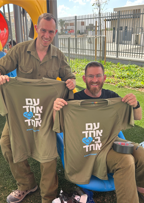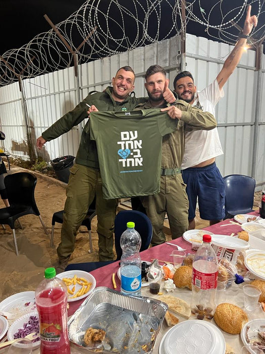 For every shirt you buy, we give a matching shirt to an IDF soldier, survivor and/or evacuee from the North and South of Israel. So far, over 5000 shirts have been given and we plan, together, for many more!